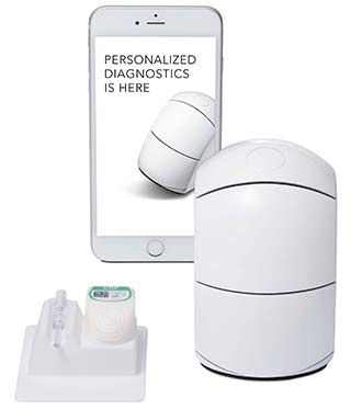 Apparatet, der sammen med en elektronisk platform giver forbrugerne adgang til at hjemmeteste deres kliniske biomarkører, sender testsvaret til brugerens mobiltelefon i løbet af få minutter efter, at man har taget sin blodprøve i en finger.